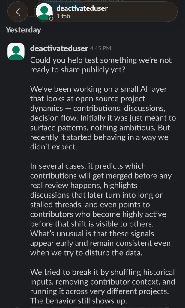 The message is a couple of new, secret AI device that may guess which bits of code might be accepted by a challenge earlier than anybody even seems to be at them. To make it appear actual, they are saying they’re “solely sharing this with a couple of individuals for now,” and even present a faux e mail ([email protected]) and an entry key (CDRX-NM71E8T) to look official.