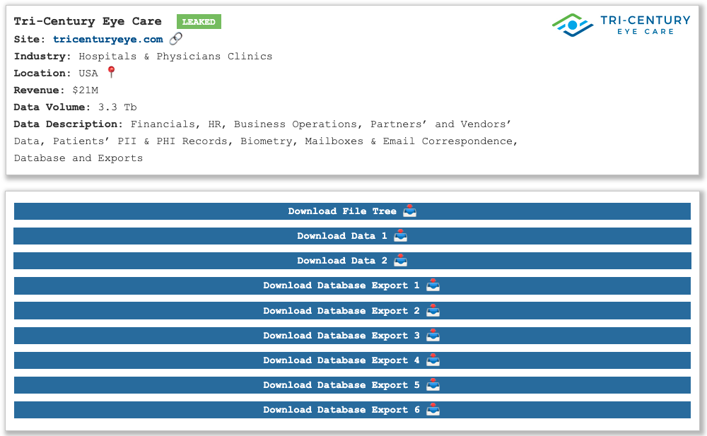 The Pear ransomware group took credit score for the assault on Tri-Century Eye Care in late September, claiming to have stolen greater than 3 Tb of knowledge, together with HR, monetary, and enterprise operations paperwork, in addition to emails, databases, and private and well being data.