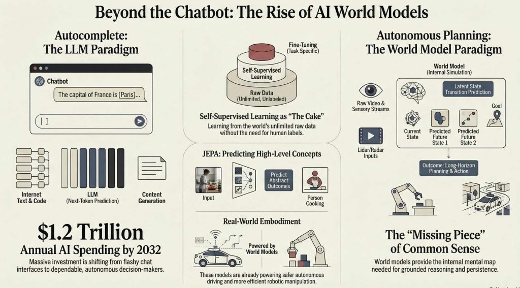 Most AI instruments really feel spectacular in a demo, then disappoint as soon as they hit actual workflows. McKinsey initiatives generative AI spending may attain 1.2 trillion {dollars} a yr by 2032, but many deployed programs nonetheless act like autocomplete engines relatively than dependable resolution makers. This widening hole between flashy chat interfaces and reliable autonomy is strictly what Yann LeCun’s new enterprise, AMI Labs, is constructed to shut. By centering its analysis on AI world fashions, inside simulations that permit machines predict, plan, and act, AMI Labs represents a deliberate break from the pure scale mindset of as we speak’s massive language mannequin leaders. For those who work in AI, robotics, product, or technique, understanding this shift is quick changing into a profession benefit as AI strikes from chat to brokers that function in each bodily and digital environments.